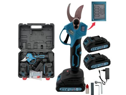 Aku zahradní nůžky s digitálním displejem. Displej zobrazuje aktuální stav baterie a počet střihů.Balení obsahuje dvě 1500 mAh baterie a malou lahvičku mazaci olej....