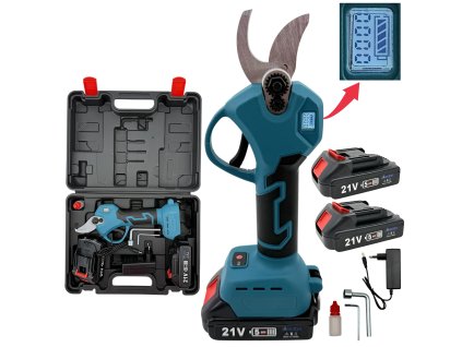 Aku zahradní nůžky s digitálním displejem. Displej zobrazuje aktuální stav baterie a počet střihů.Balení obsahuje dvě 1300 mAh baterie a malou lahvičku mazaci olej....