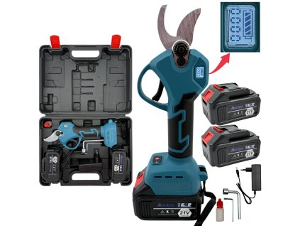 Aku zahradní nůžky s digitálním displejem. Displej zobrazuje aktuální stav baterie a počet střihů.Balení obsahuje dvě 2600 mAh baterie a malou lahvičku mazaci olej....