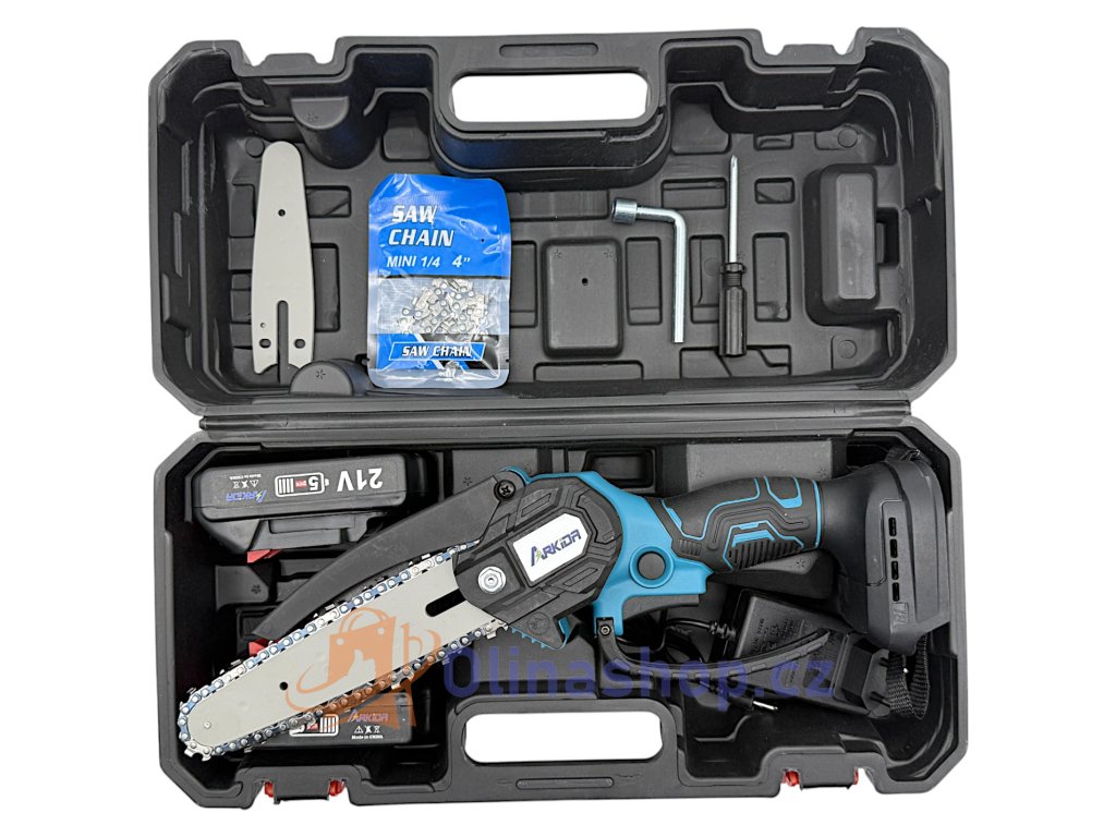 Aku mini řetězová pila je kompaktní a přenosný nástroj ideální pro různé zahradní a stavební práce. Tato pila je vybavena 21V akumulátorem, který poskytuje dostatečný výkon pro řezání dřeva a dalších materiálů. Sada je dodávána včetně příslušenství potřebného k okamžitému provozu pily. Pro práci s mini aku pilou stačí mít nabitou baterii, není zapotřebí kabel ani benzín, je to skvělý pomocník. Pila může řezat dřevo do průměru 10-15 cm.