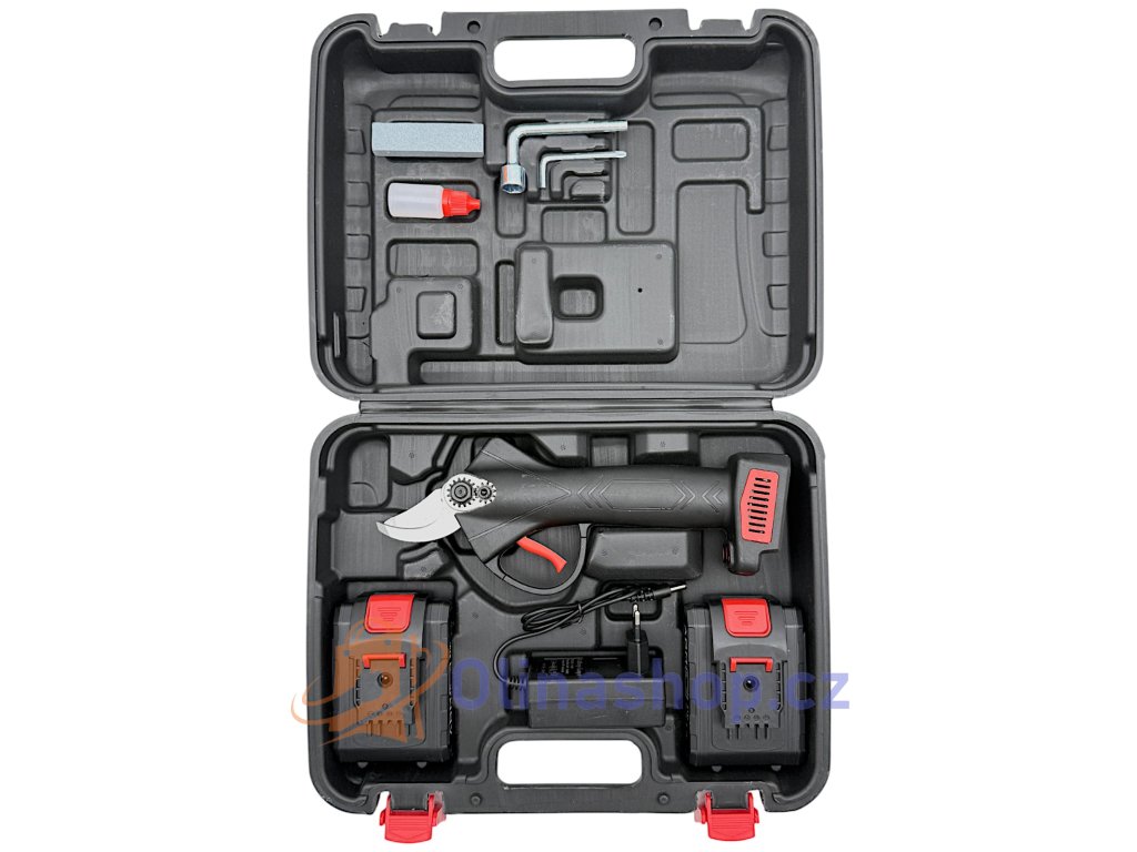Aku zahradní nůžky s digitálním displejem. Displej zobrazuje aktuální stav baterie a počet střihů.Balení obsahuje dvě 2600 mAh baterie a malou lahvičku mazaci olej....