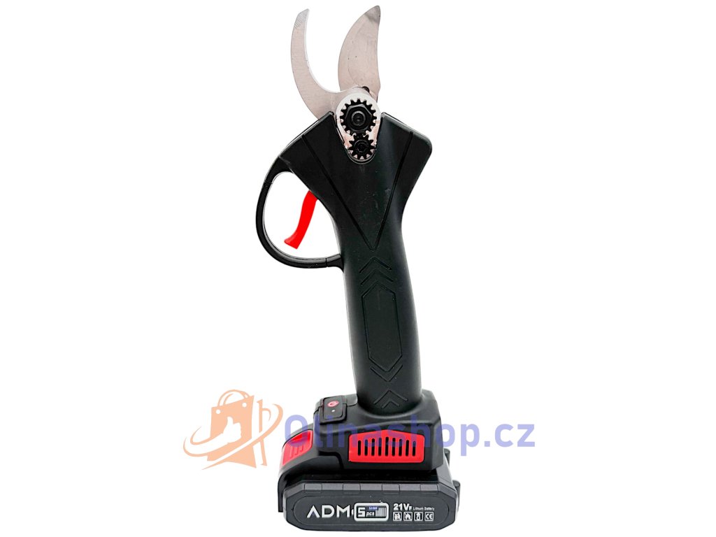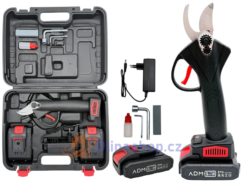 Aku zahradní nůžky . Displej zobrazuje aktuální stav baterie a počet střihů.Balení obsahuje dvě 1300 mAh baterie a malou lahvičku mazaci olej. ADM-1001