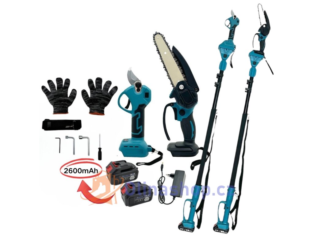 - Obsah balení: Elektrická prořezávací pila, elektrické nůžky, dvě 21V baterie, nabíječka, ostřič, šroubovák,klíče, popruh
