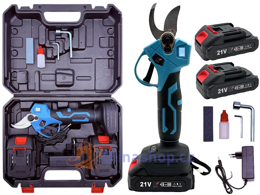 Aku zahradní nůžky s digitálním displejem. Displej zobrazuje aktuální stav baterie a počet střihů.Balení obsahuje dvě 1500 mAh baterie a malou lahvičku mazaci olej....
