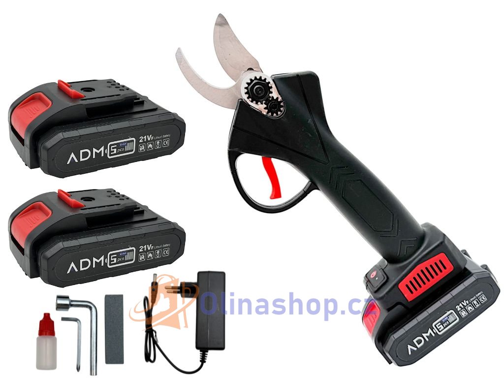 Aku zahradní nůžky . Displej zobrazuje aktuální stav baterie a počet střihů.Balení obsahuje dvě 1300 mAh baterie a malou lahvičku mazaci olej. ADM-1001