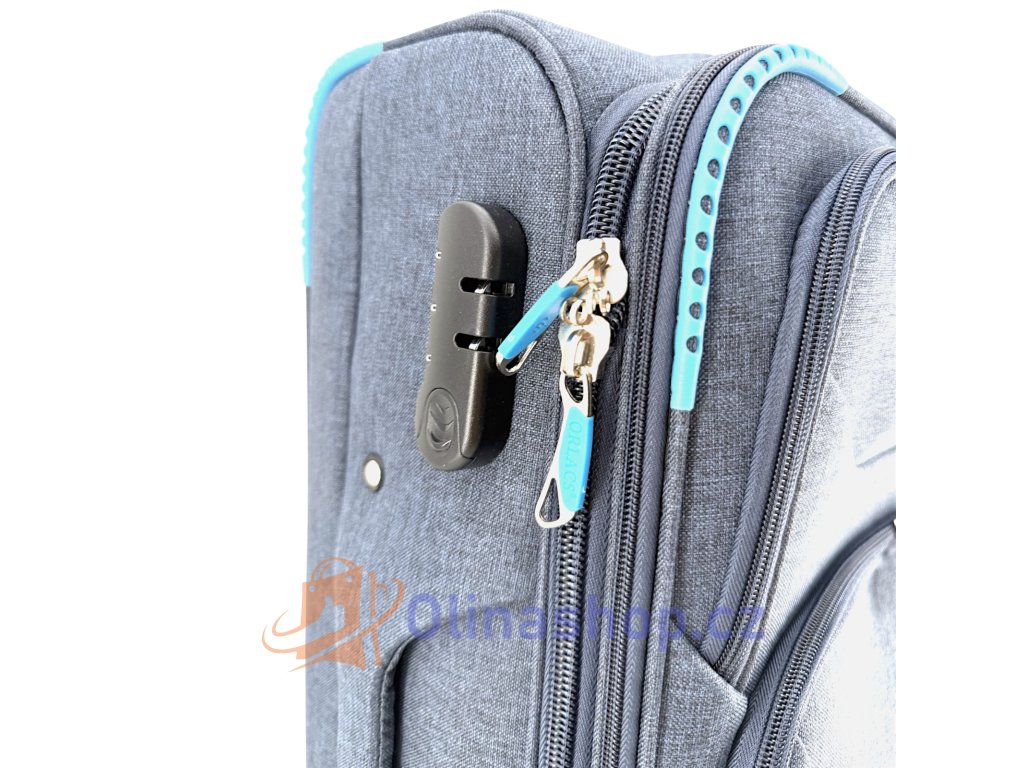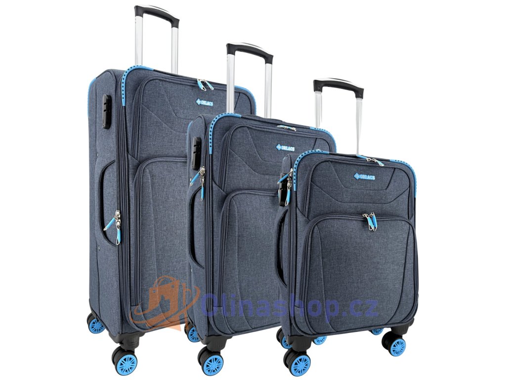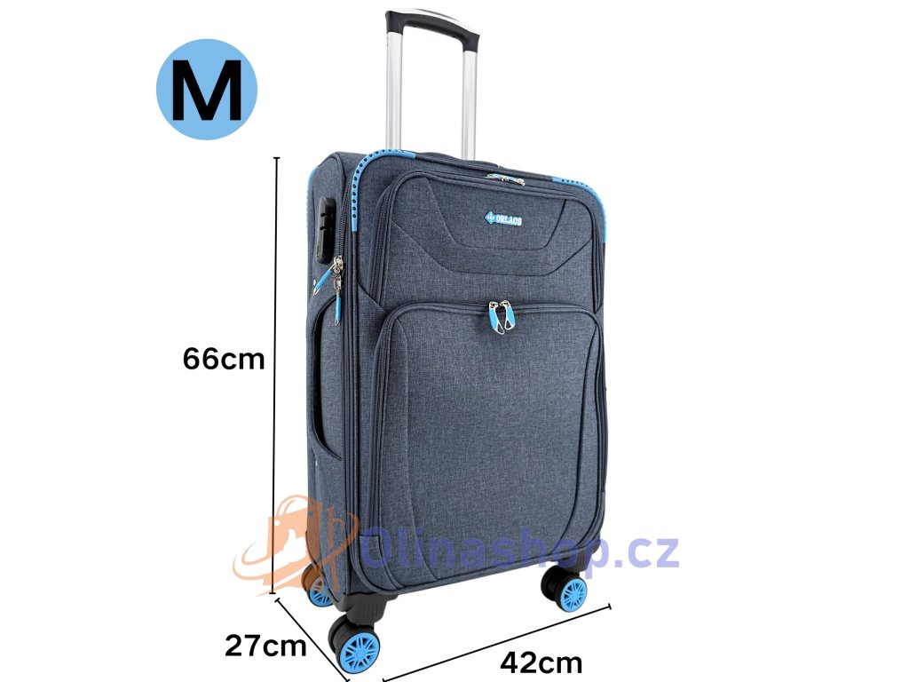 Textilních kufrů ORLACS 2025-1# s otočnými 4 kolečky, teleskopickou rukojetí a odolným materiálem. Obsahuje velikosti S (kabinový), M (střední) a L (velký). Rozšíření objemu...