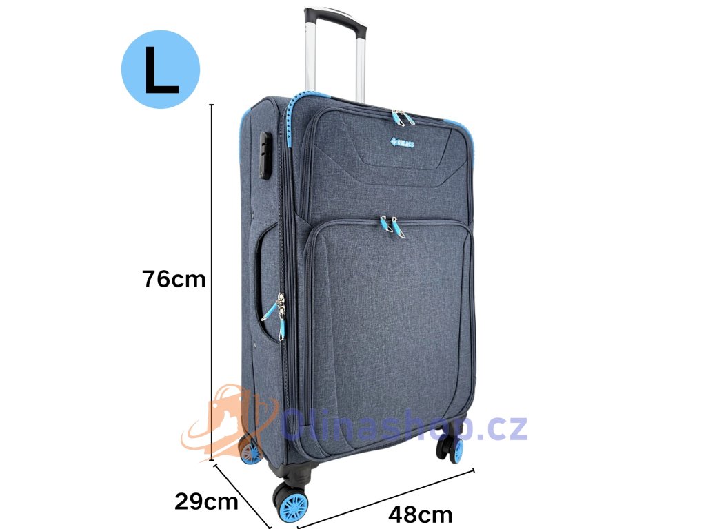 Textilních kufrů ORLACS 6004# s otočnými 4 kolečky, teleskopickou rukojetí a odolným materiálem. Obsahuje velikosti S (kabinový), M (střední) a L (velký). Rozšíření objemu...