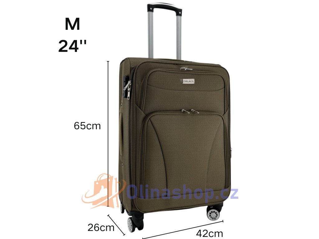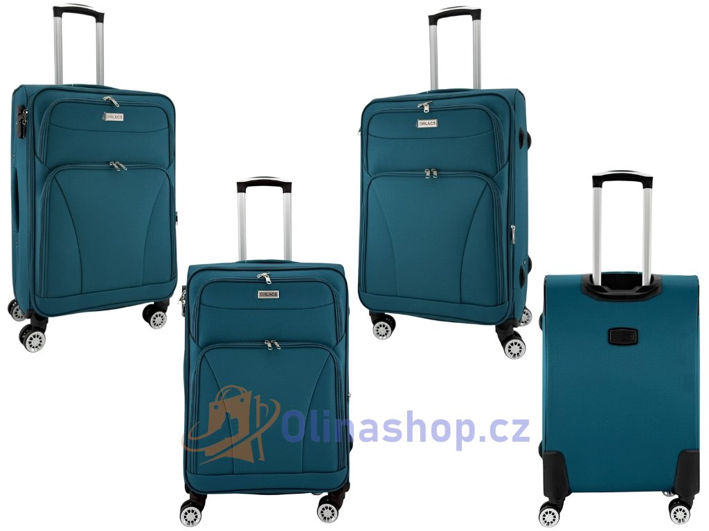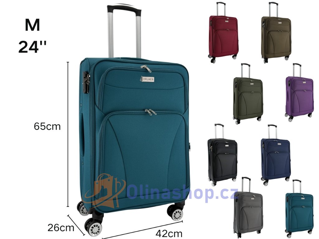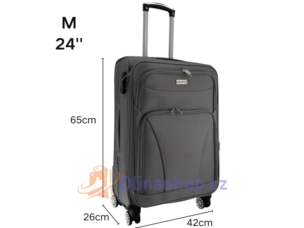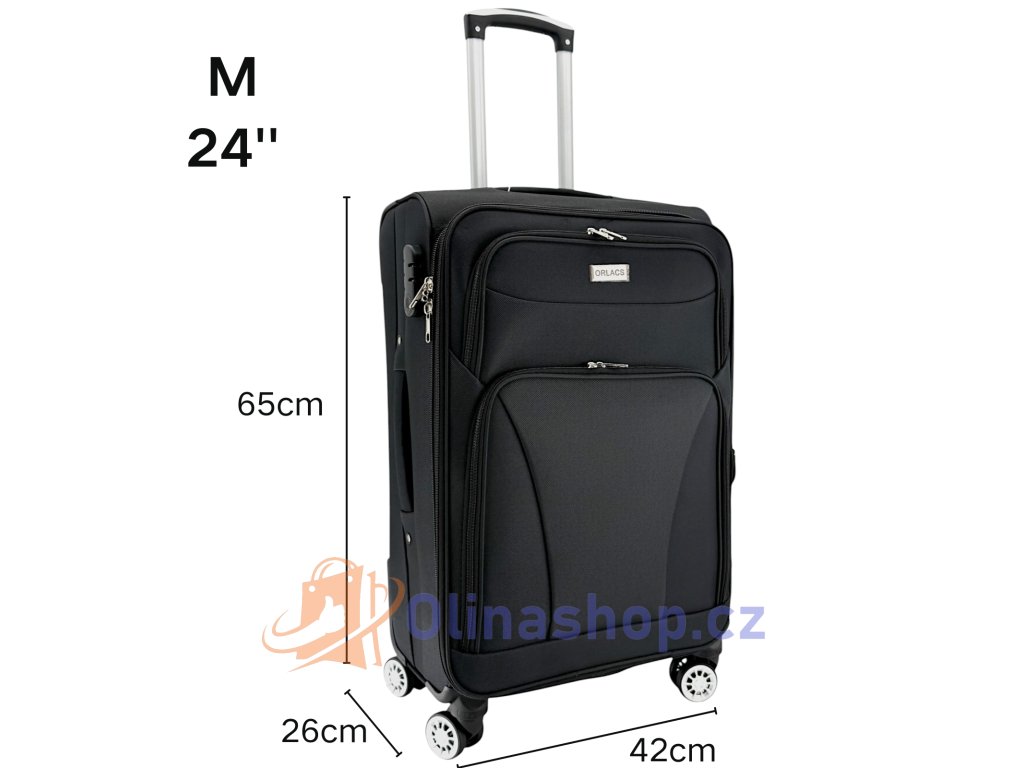 Textilních kufrů ORLACS 6004# s otočnými 4 kolečky, teleskopickou rukojetí a odolným materiálem. Obsahuje velikosti S (kabinový), M (střední) a L (velký). Rozšíření objemu...