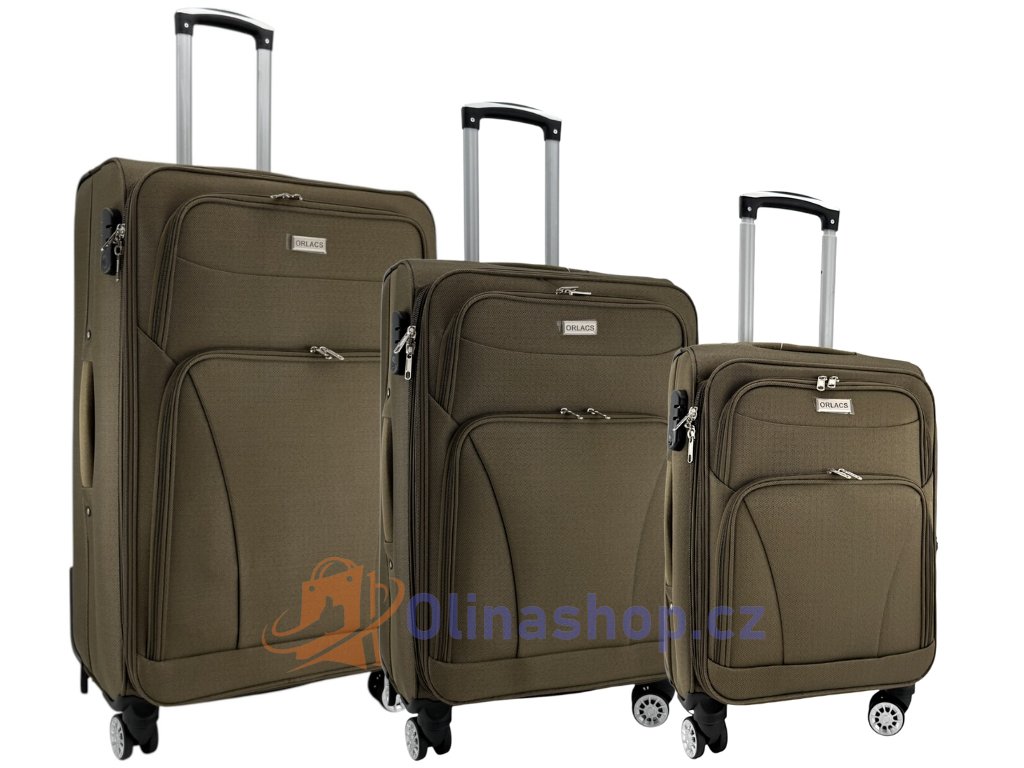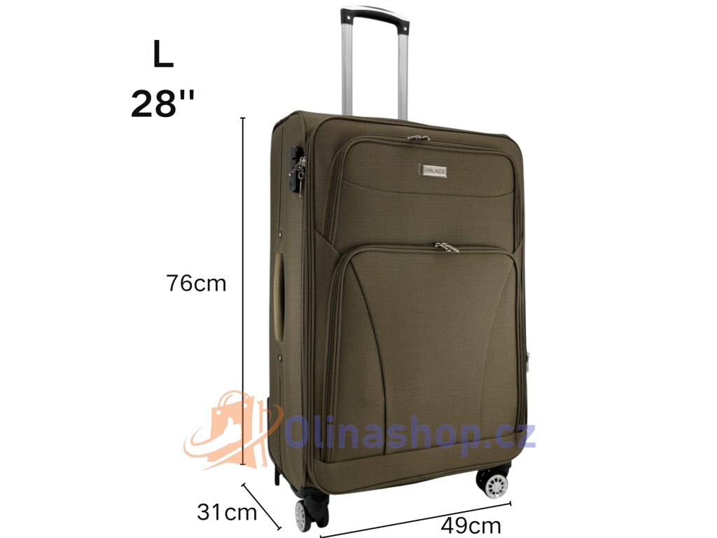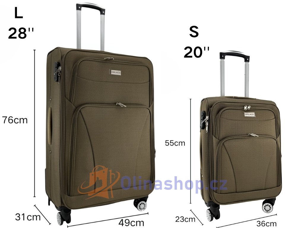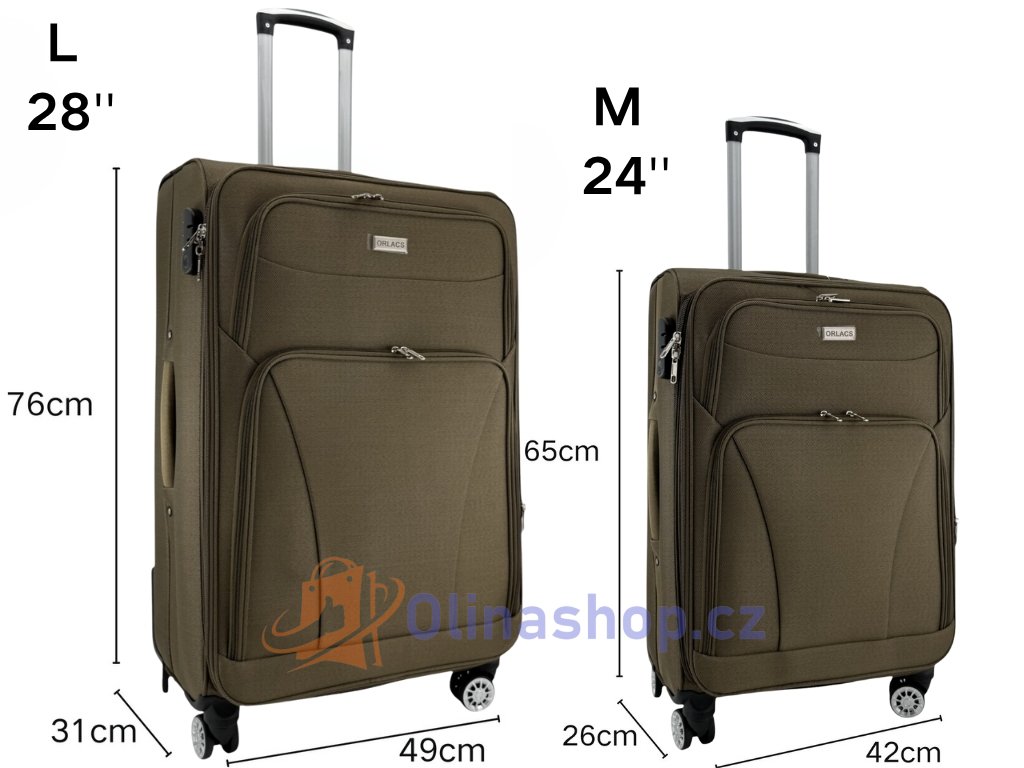 Textilních kufrů ORLACS 6004# s otočnými 4 kolečky, teleskopickou rukojetí a odolným materiálem. Obsahuje velikosti S (kabinový), M (střední) a L (velký). Rozšíření objemu...