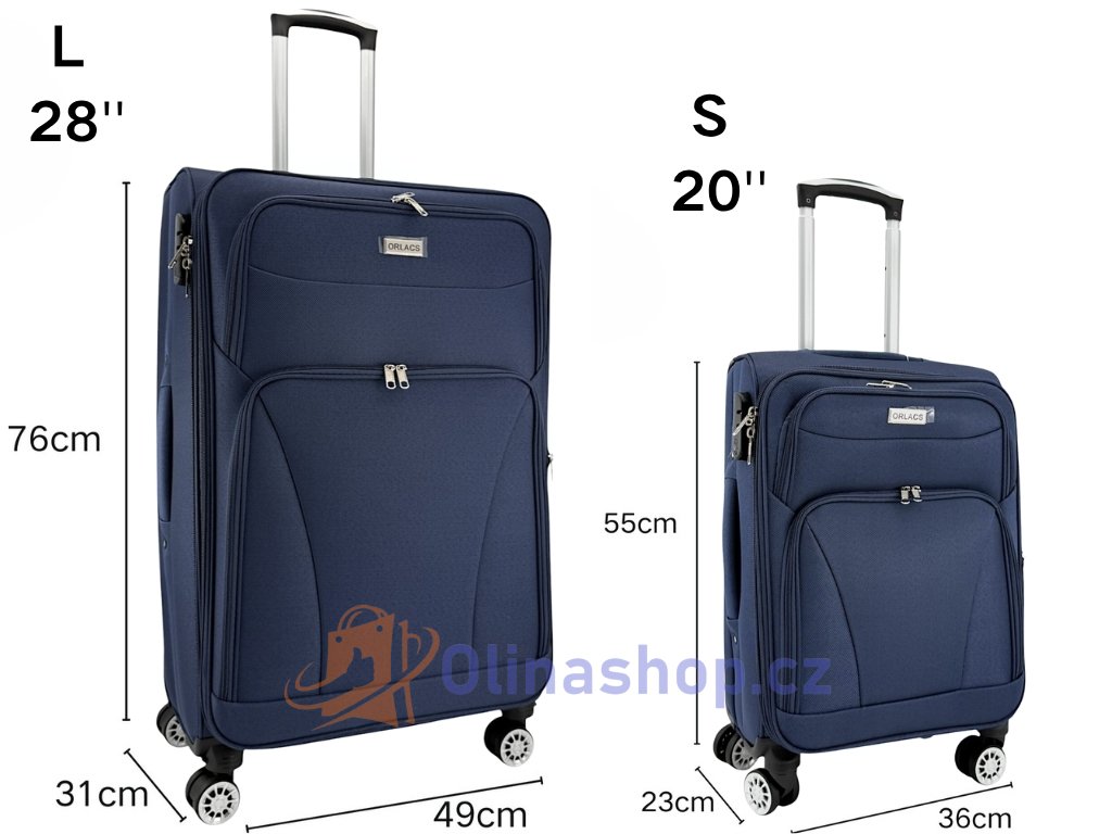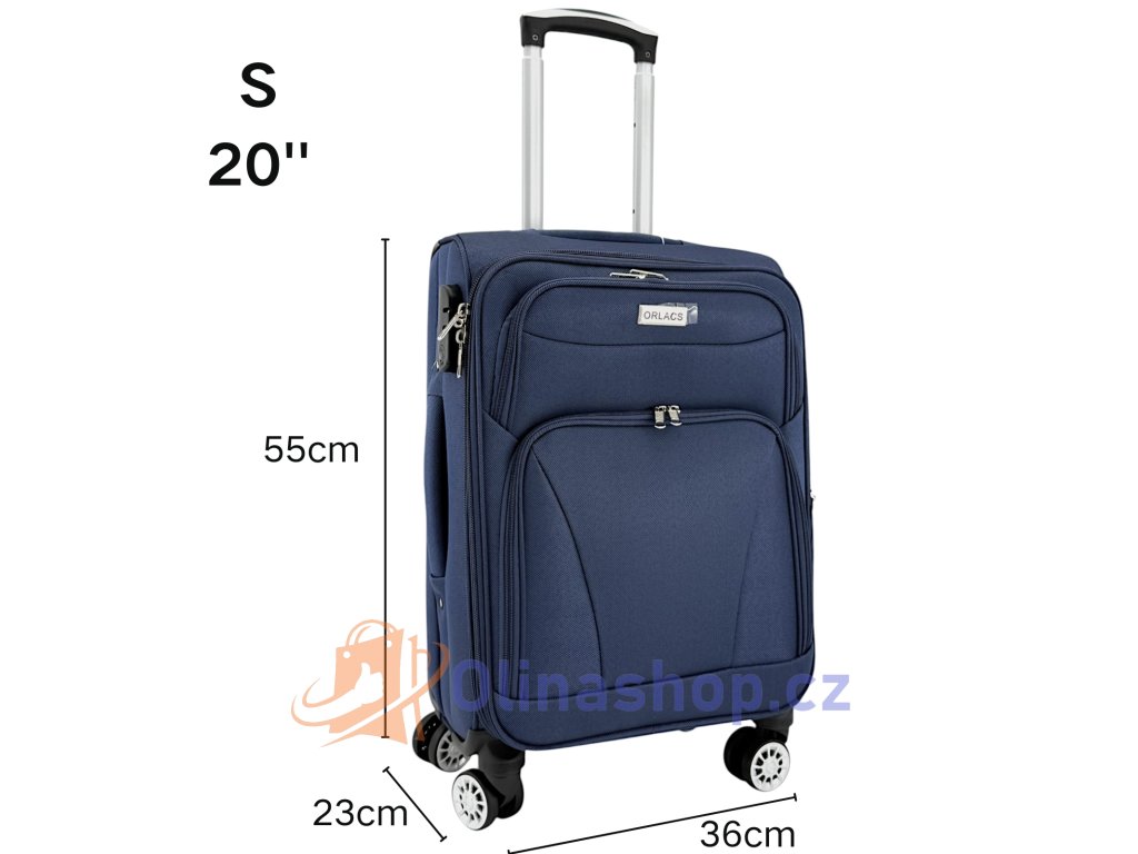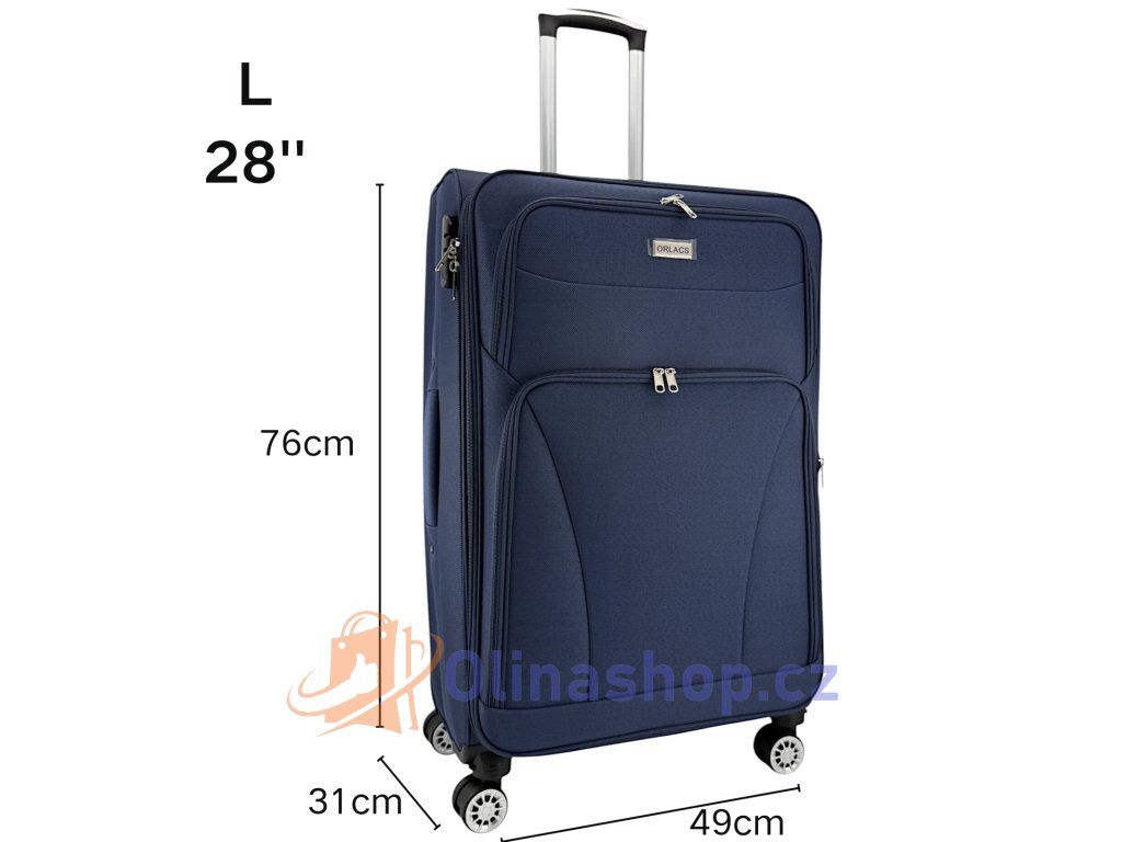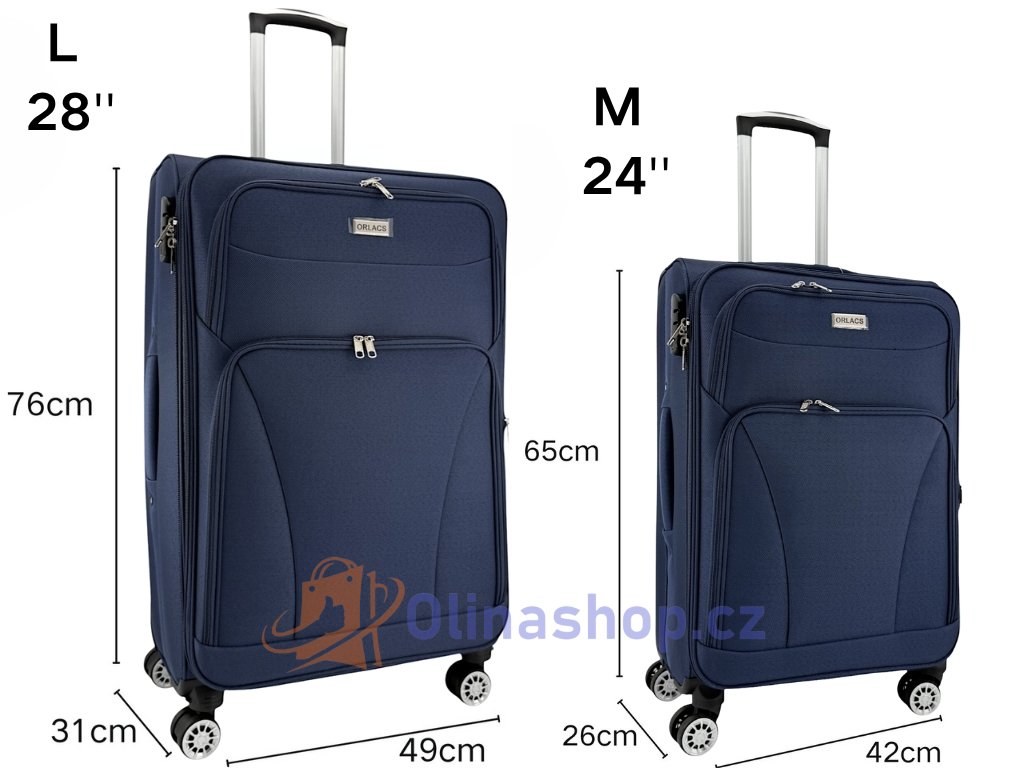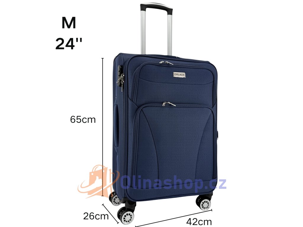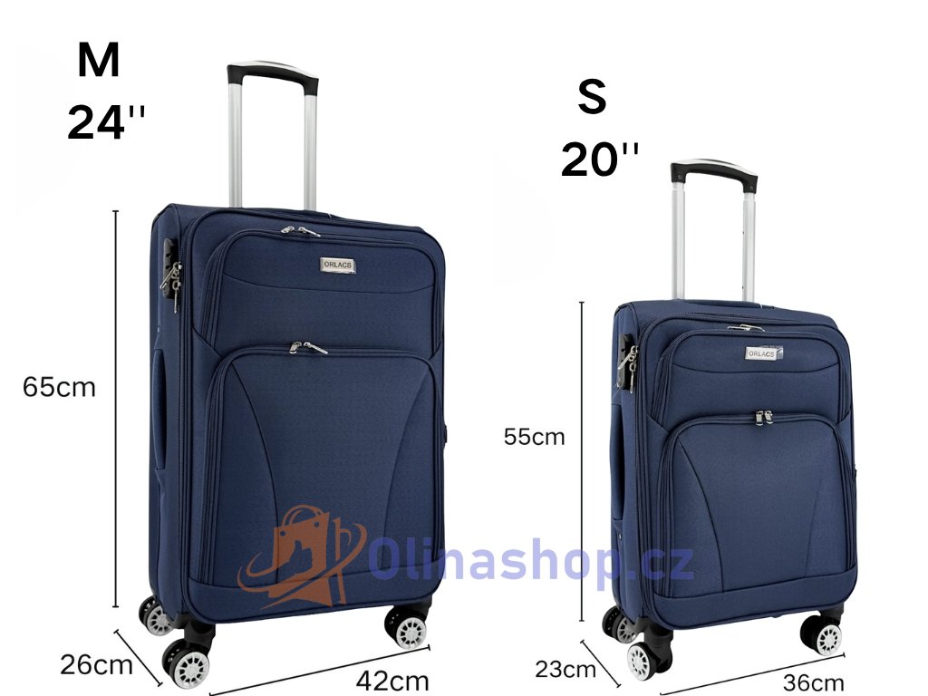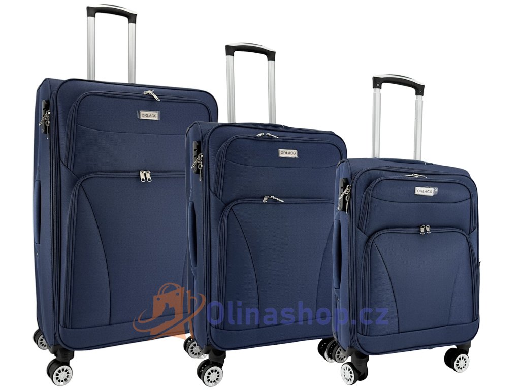 Textilních kufrů ORLACS 6004# s otočnými 4 kolečky, teleskopickou rukojetí a odolným materiálem. Obsahuje velikosti S (kabinový), M (střední) a L (velký). Rozšíření objemu...