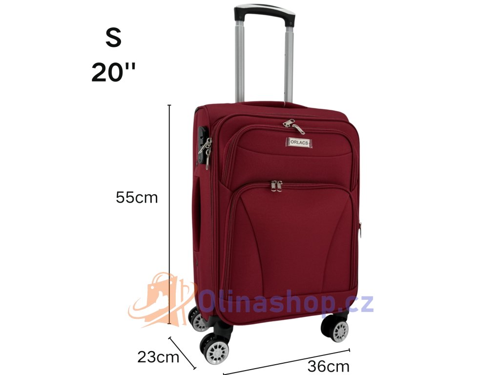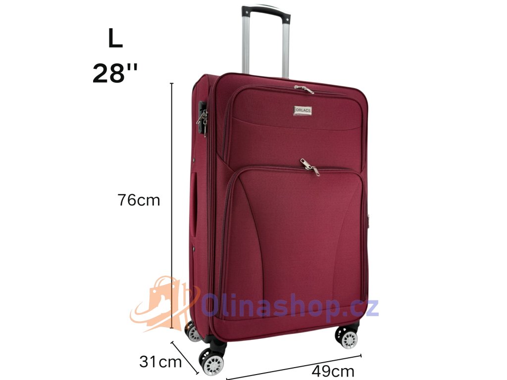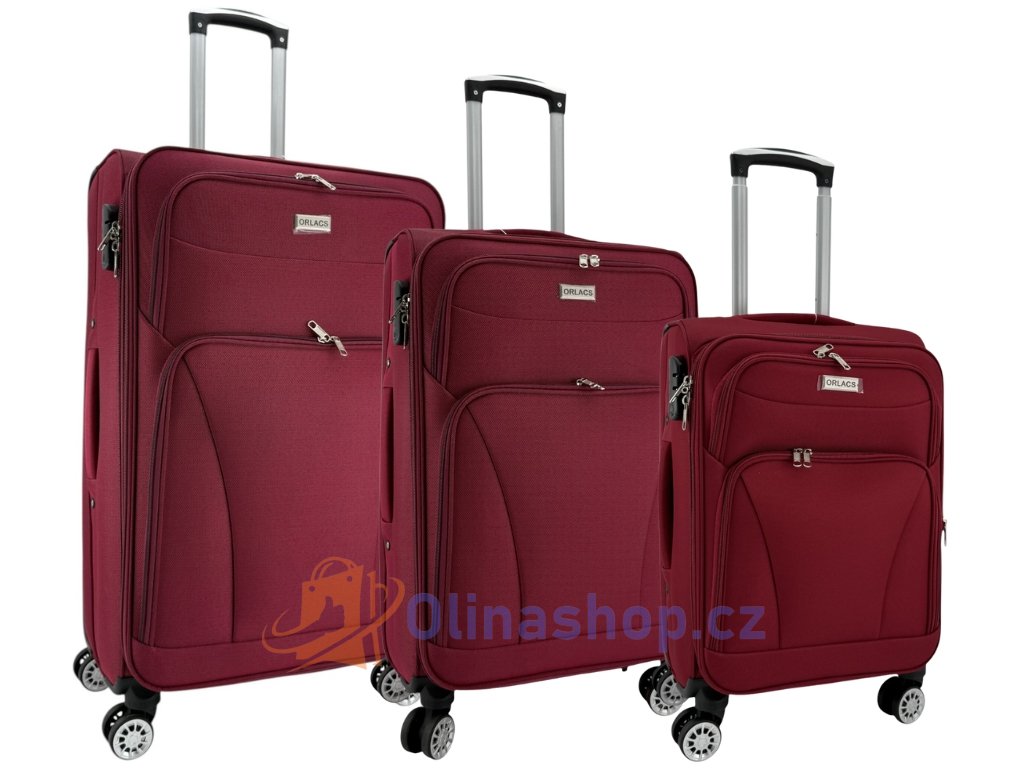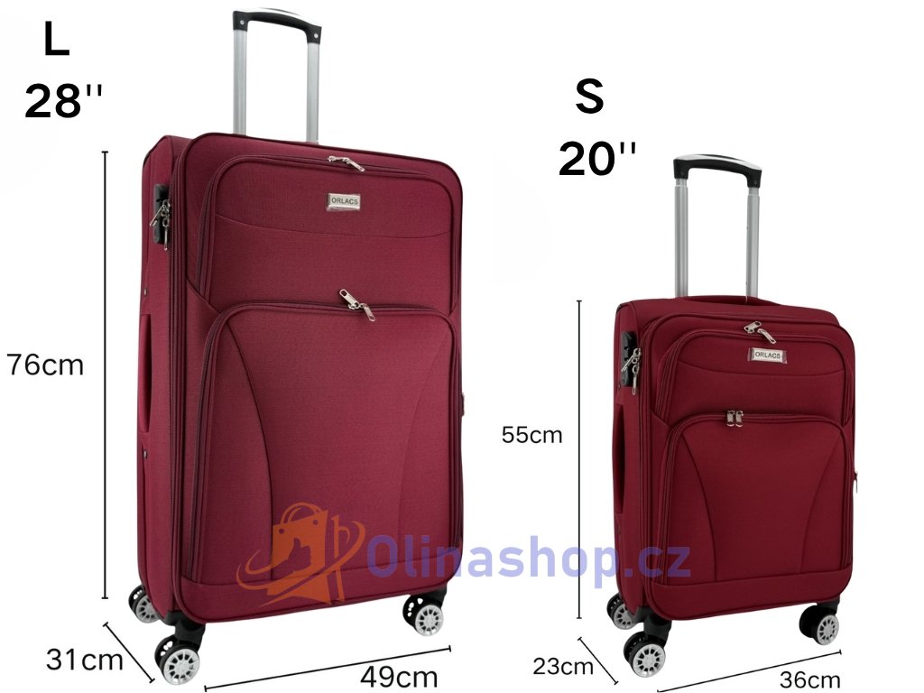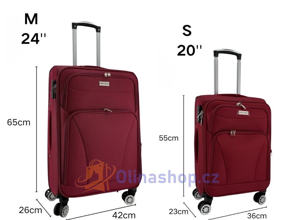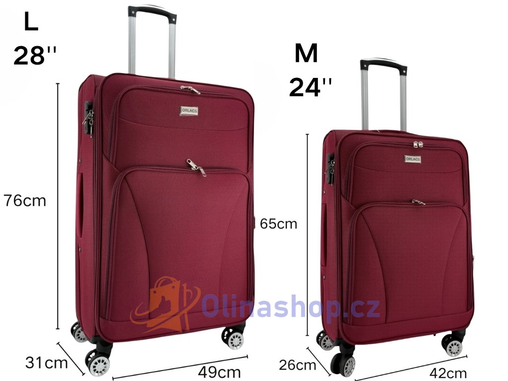 Textilních kufrů ORLACS 6004# s otočnými 4 kolečky, teleskopickou rukojetí a odolným materiálem. Obsahuje velikosti S (kabinový), M (střední) a L (velký). Rozšíření objemu...
