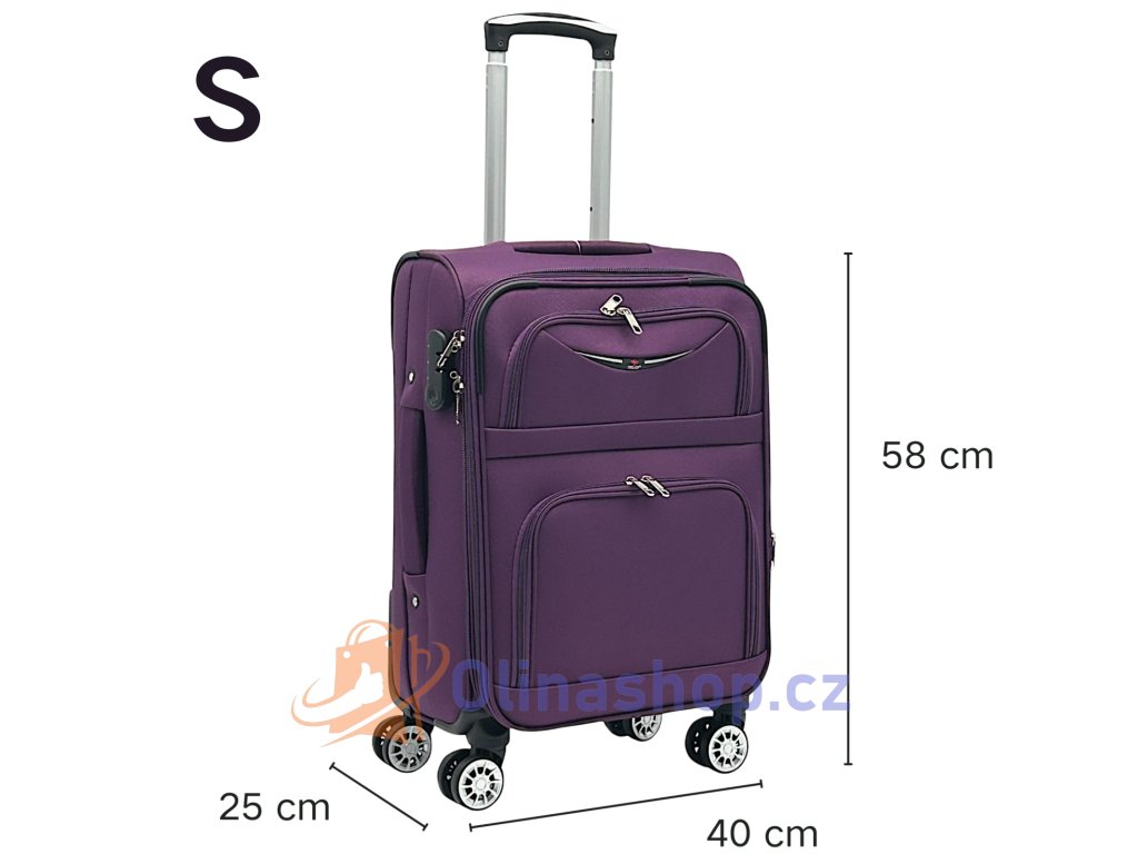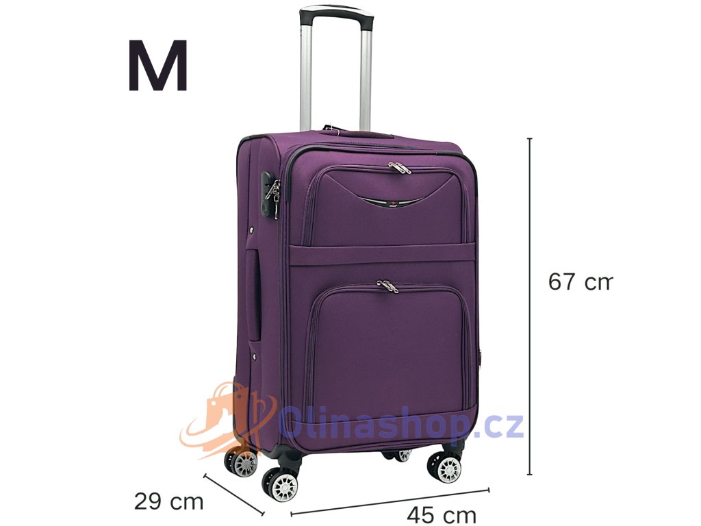 Textilních kufrů ORLACS 6004# s otočnými 4 kolečky, teleskopickou rukojetí a odolným materiálem. Obsahuje velikosti S (kabinový), M (střední) a L (velký). Rozšíření objemu...