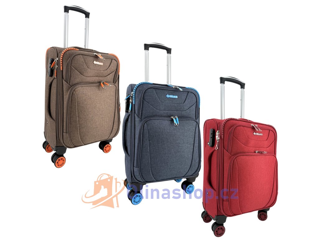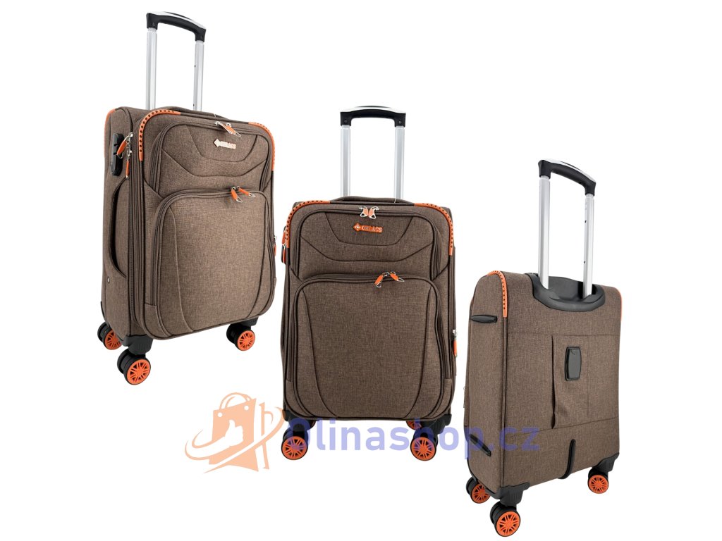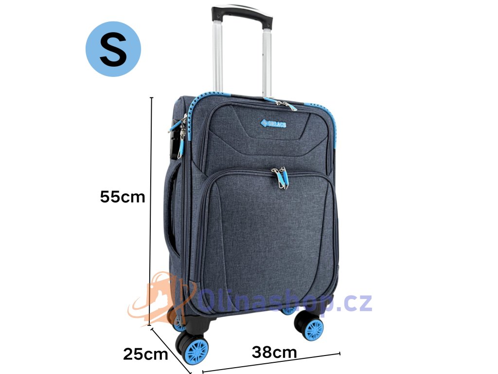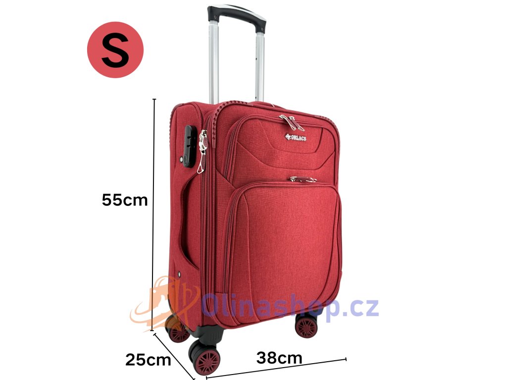 Textilních kufrů ORLACS 6004# s otočnými 4 kolečky, teleskopickou rukojetí a odolným materiálem. Obsahuje velikosti S (kabinový), M (střední) a L (velký). Rozšíření objemu...