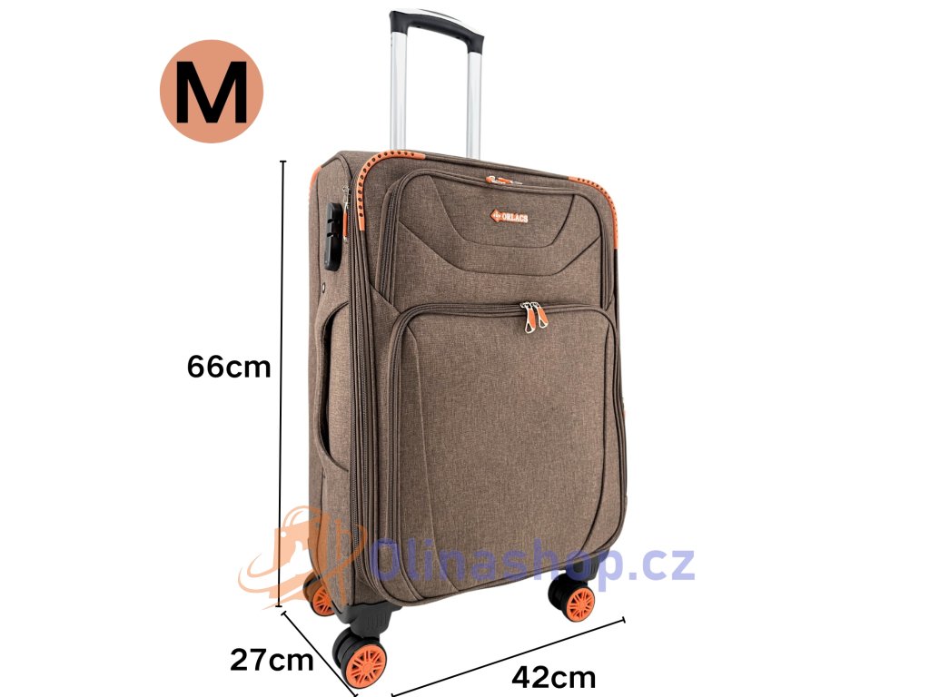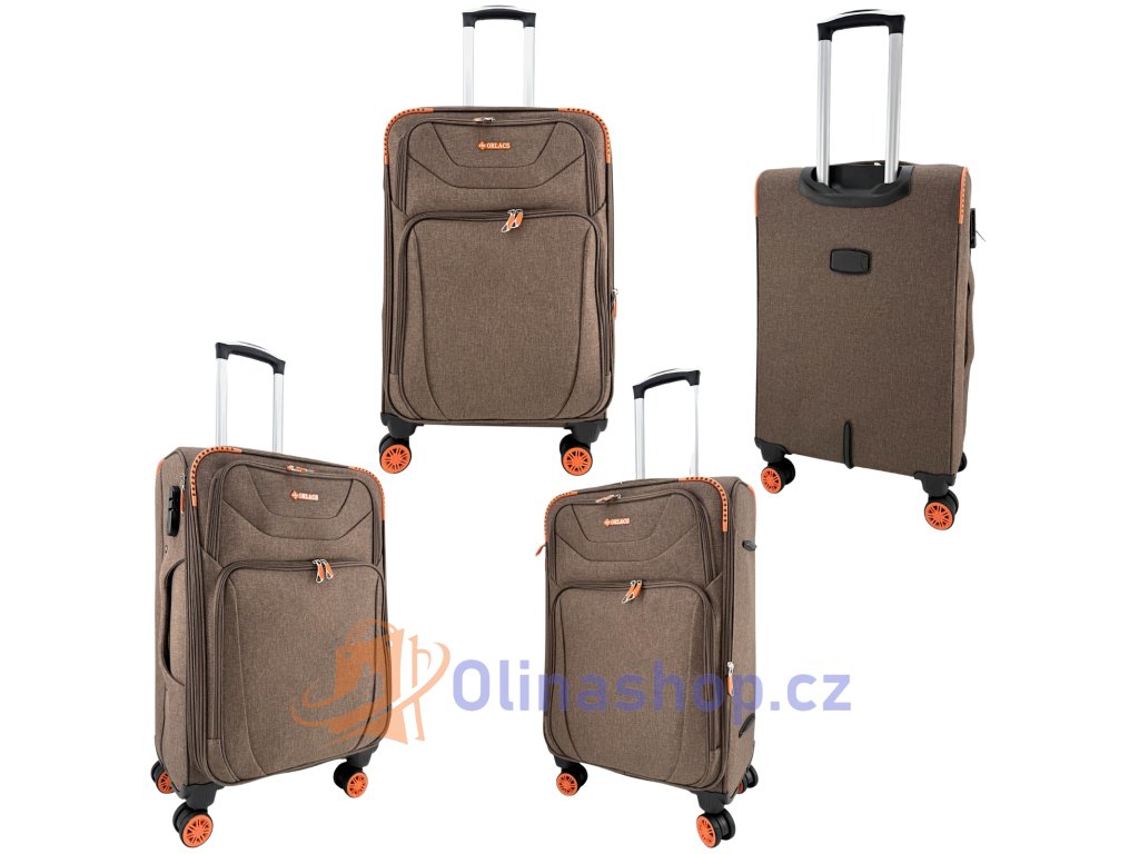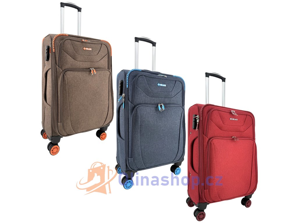 Textilních kufrů ORLACS 6004# s otočnými 4 kolečky, teleskopickou rukojetí a odolným materiálem. Obsahuje velikosti S (kabinový), M (střední) a L (velký). Rozšíření objemu...