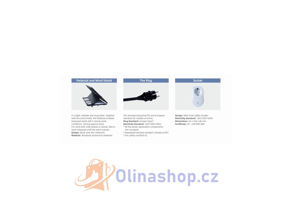 v současti sady jsou 2 skladací solární panely , 1 střídač , 1 kabel , 1 adaptér s vypínačem .