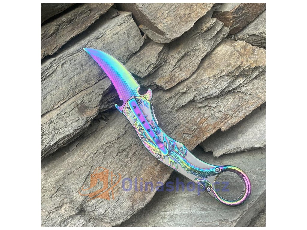 Designový nůž má čepel ve tmavostříbné barvě a zoubkové ostří. Zajímavým designem je také rukojeť, která je plná zajímavých lebku. K otevření stačí využít jediným prstem během...