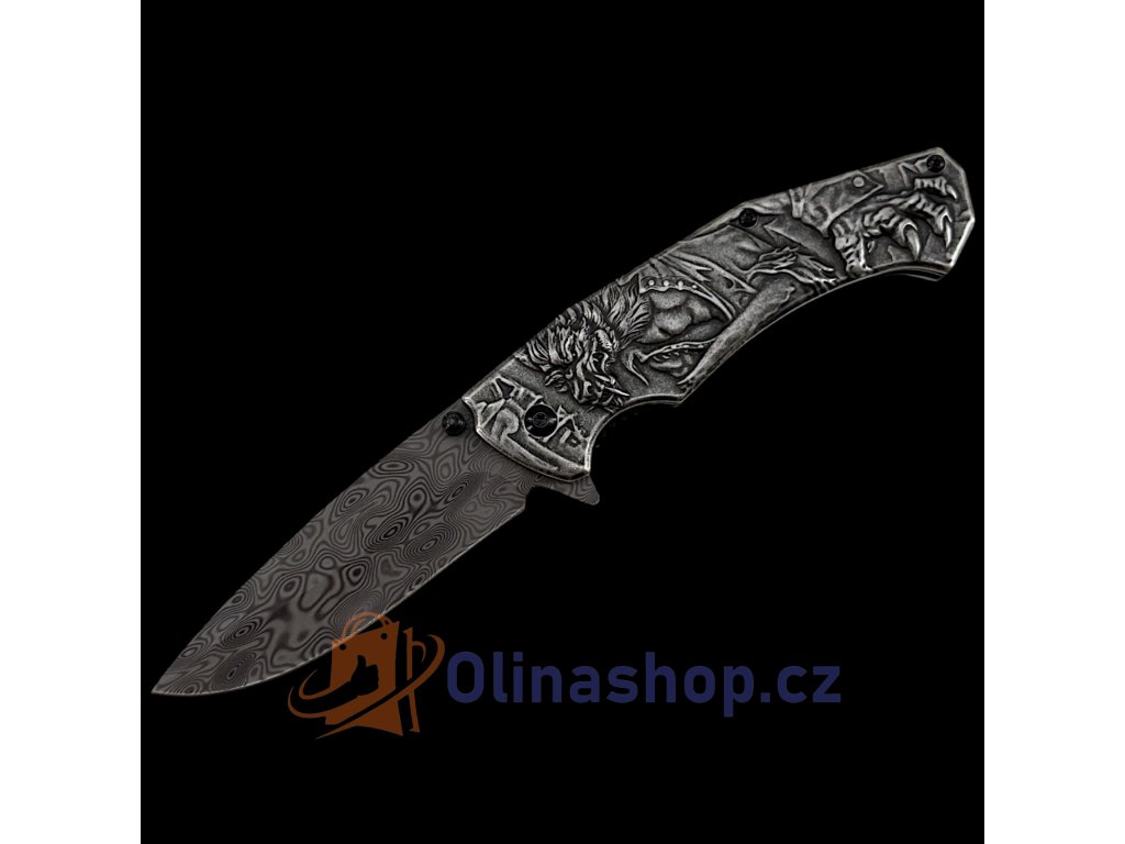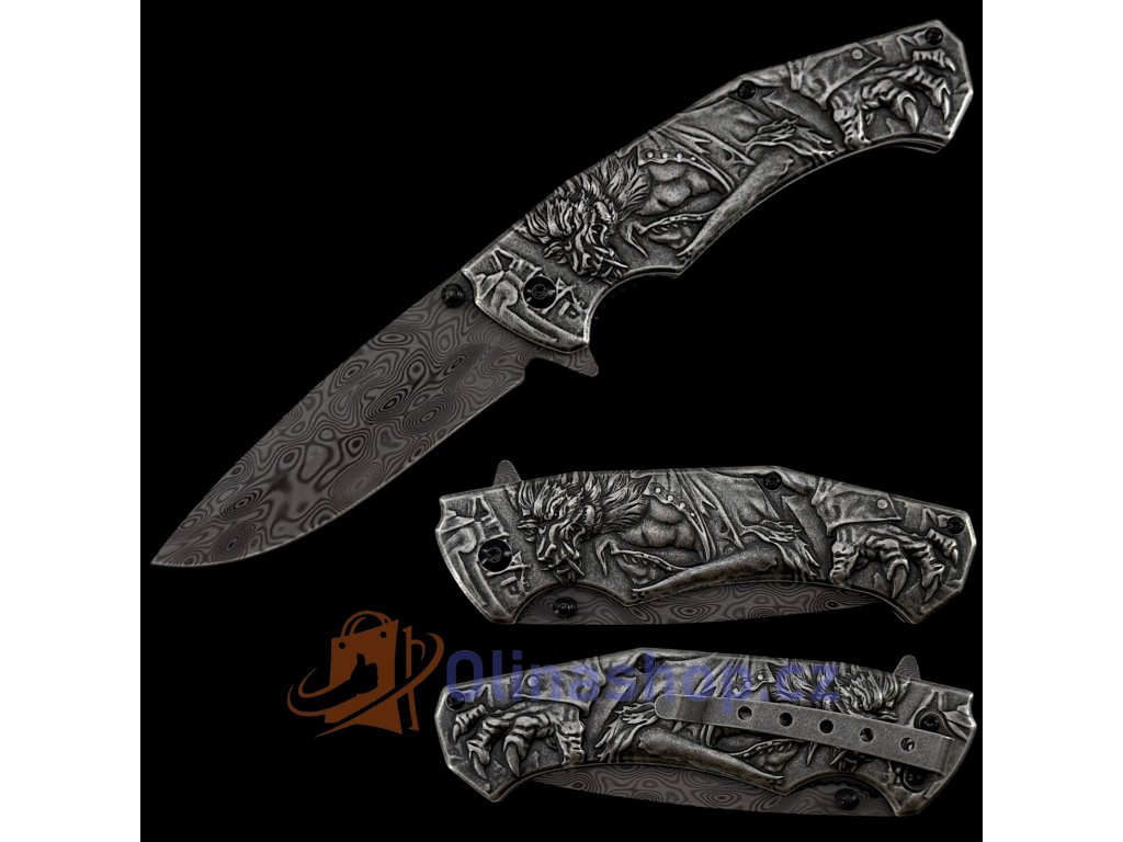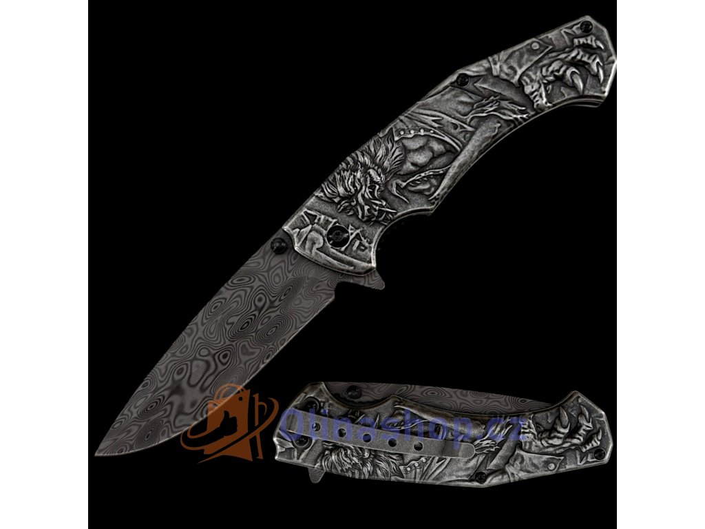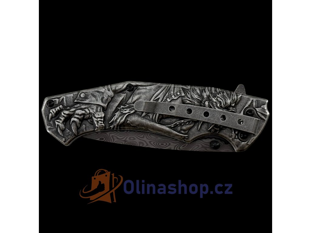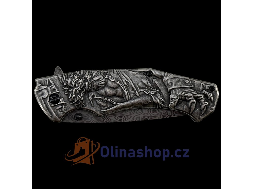 Rukojeť je zdobená detailním gravírovaným motivem vlka, druhá strana je vybavena praktickým kovovým klipem pro pohodlné nošení. Nůž má pojistku a asistované otevírání jednou rukou. Celková délka nože je cca 21,5 cm.